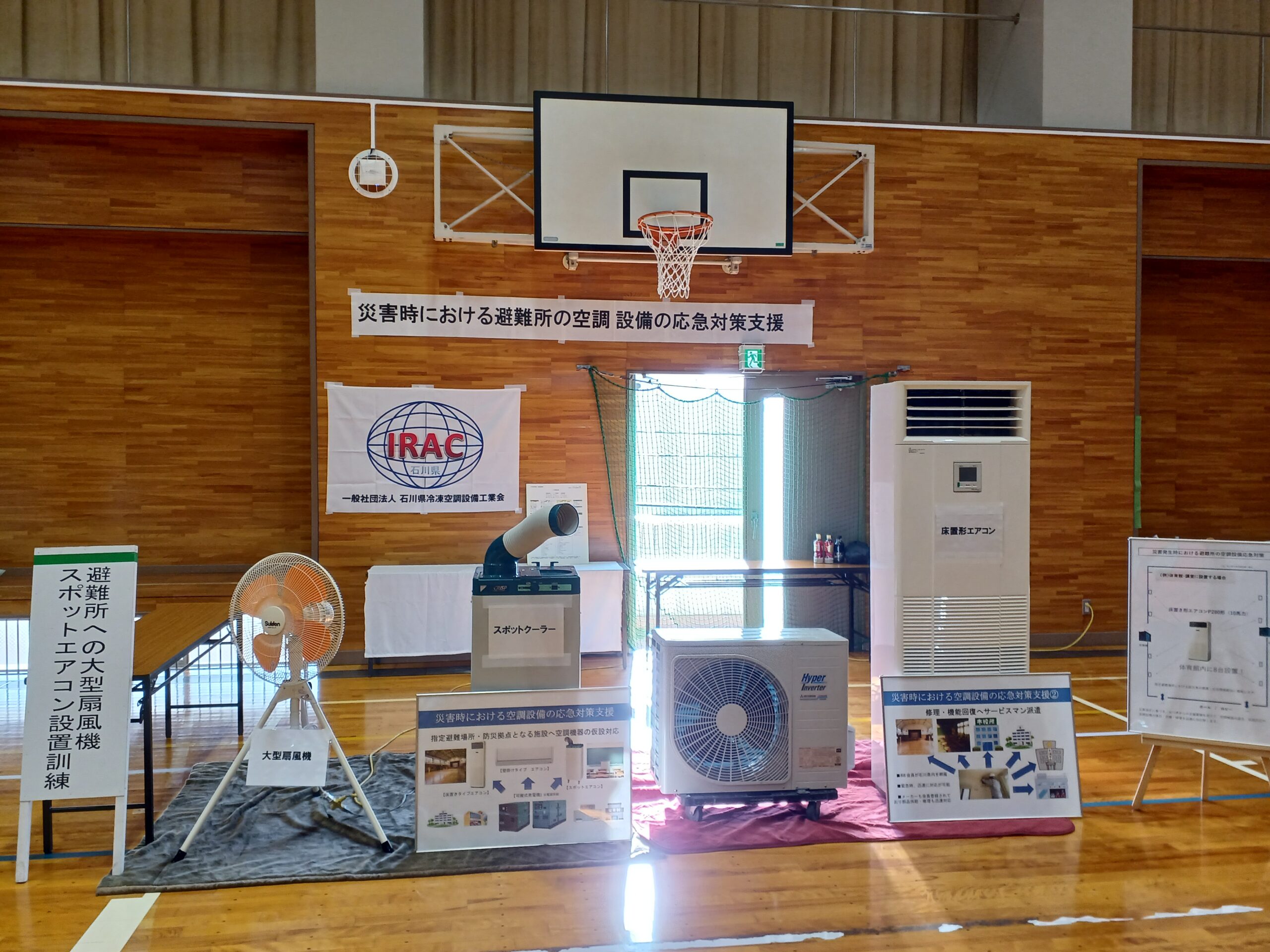 平成30年5月29日に締結した石川県との災害協定に基づき、石川県防災総合訓練に参加。 体育館内の工業会ブースにて、災害時における避難所の空調設備の応急対策支援として 大型扇風機・スポットクーラー・床置形エアコンを展示実演しました。