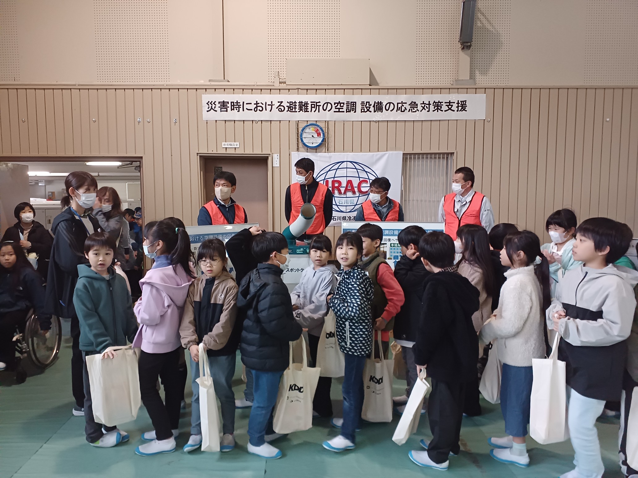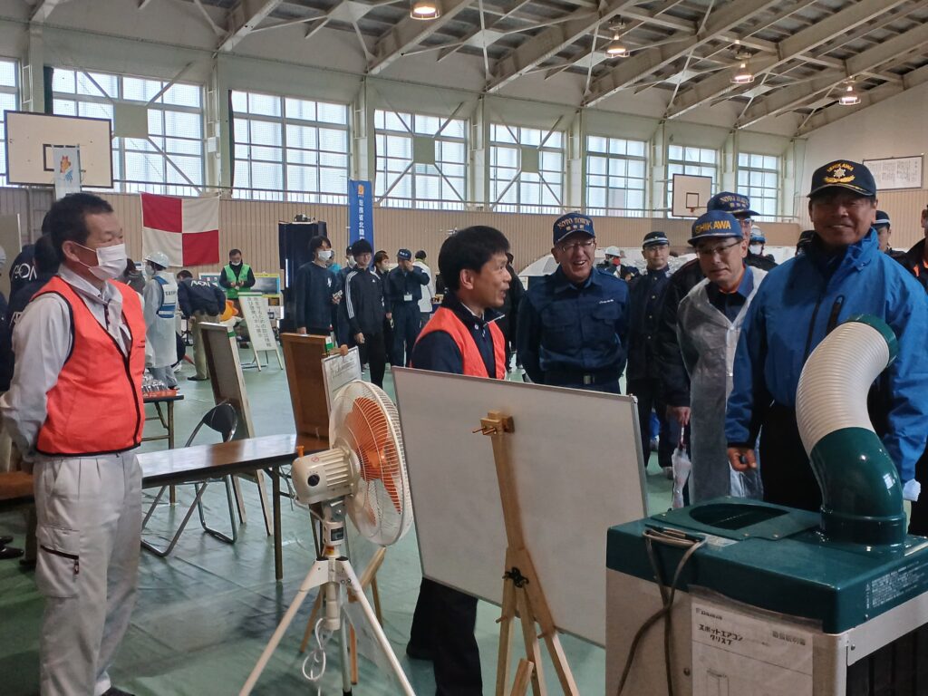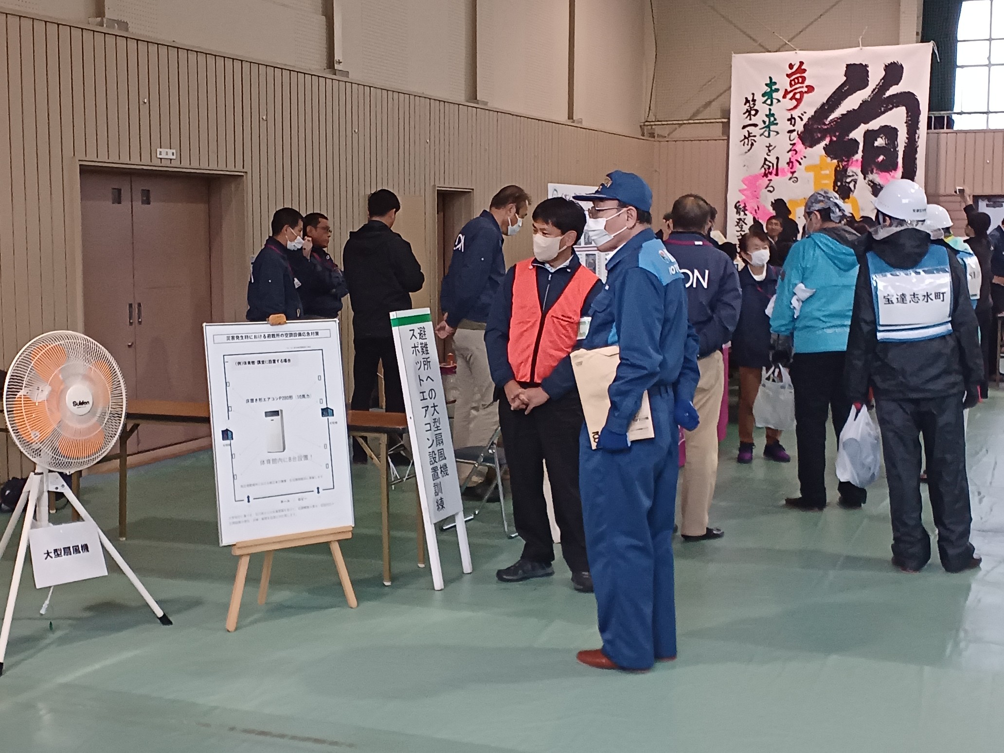 体育館内の工業会ブースにて 避難所への応急設置支援として、大型扇風機・スポットエアコンを展示しました。